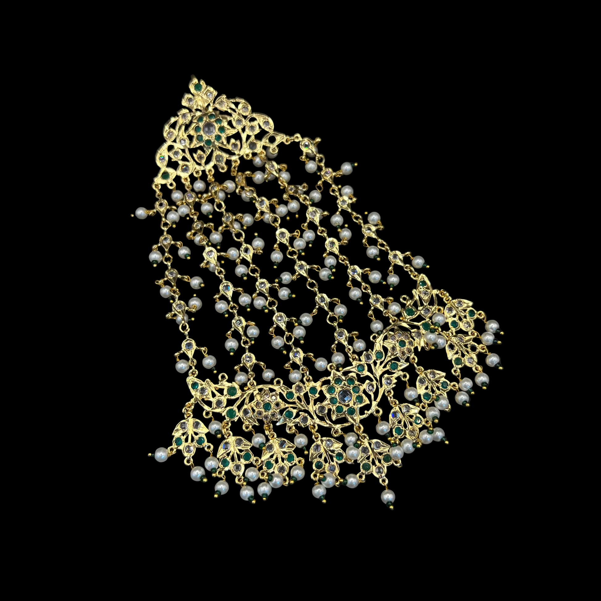 Handcrafted with exquisite jadau stonework, delicate pearls, and rich green accents, this statement headpiece exudes elegance and heritage.