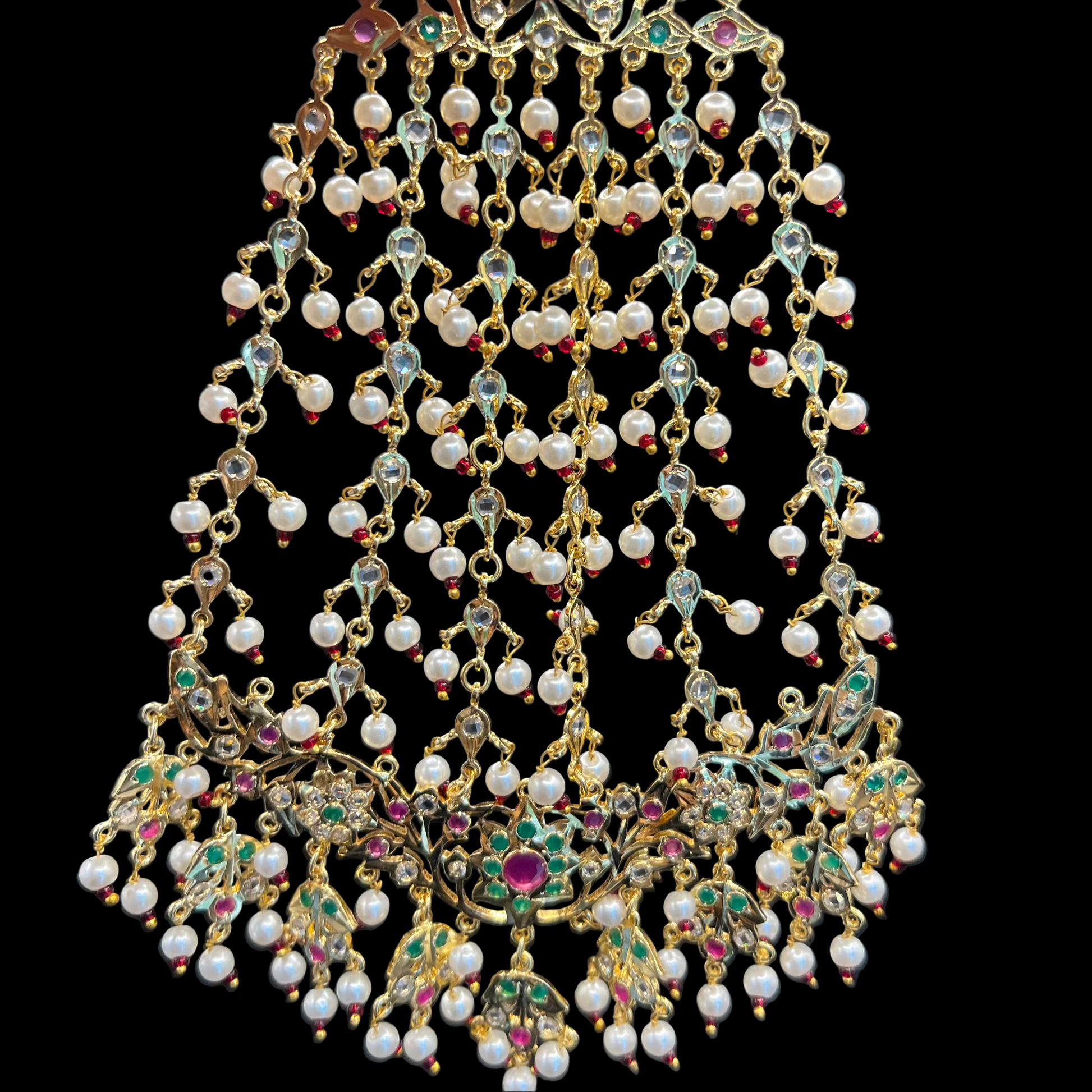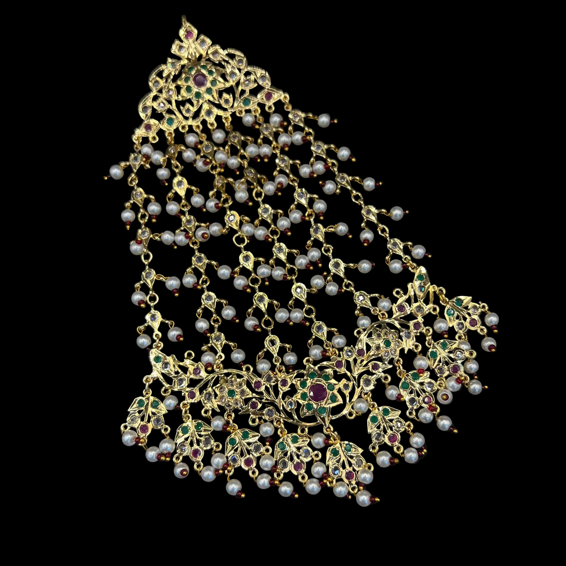 Handcrafted with exquisite jadau stonework, delicate pearls, and rich green&red accents, this statement headpiece exudes elegance and heritage.